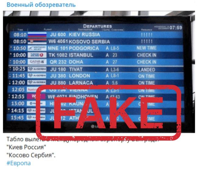 Анонімні телеграм-канали діляться фото, на якому зображене табло з сербського аеропорту. Нібито там запровадили рейс до Києва, проте саме місто вказане як російське.