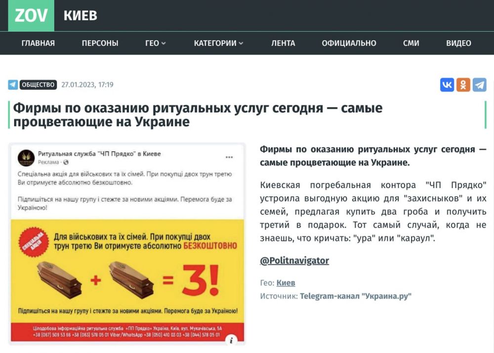 Пропагандистські ресурси поширюють знімок з екрану нібито рекламного оголошення київської ритуальної служби «ПП Прядок». Мовляв, реклама пропонує спеціальну акцію для військових та їхніх сімей, купуючи дві трути — трєтя у подарунок. А також додається, що ритуальні послуги наразі одна щ найуспішніших сфер в Україні. Але це неправда.