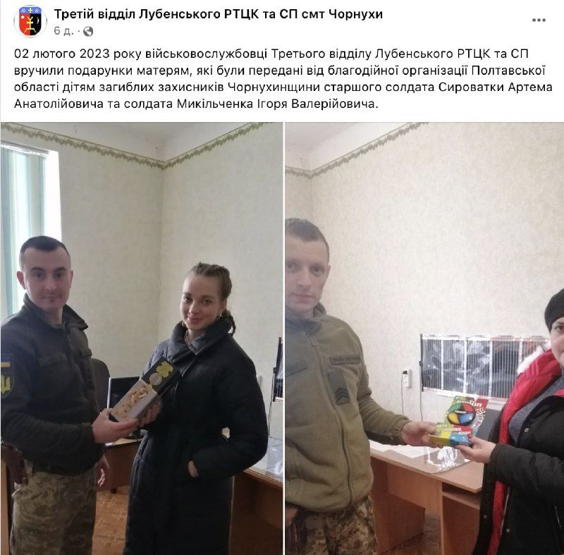 За словами фахівців проєкту StopFake, основою для фейку став допис Третього відділення Лубенського районного територіального центру комплектації та соцпідтримки селища Чорнухи Полтавської області у соцмережі Facebook. Однак це лише частина допомоги, місцевий благодійний фонд дарує іграшки для дітей. Згідно з законодавством України, рідні військовослужбовця, який загинув на фронті, можуть отримати допомогу від держави розміром 15 млн грн.
