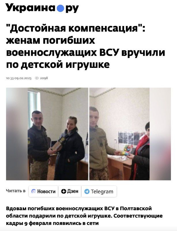 Російські ЗМІ поширюють новину, що нібито держава виплачує «компенсацію» у вигляді іграшки родичам українських військових, які загинули на фронті. Це — неправда.