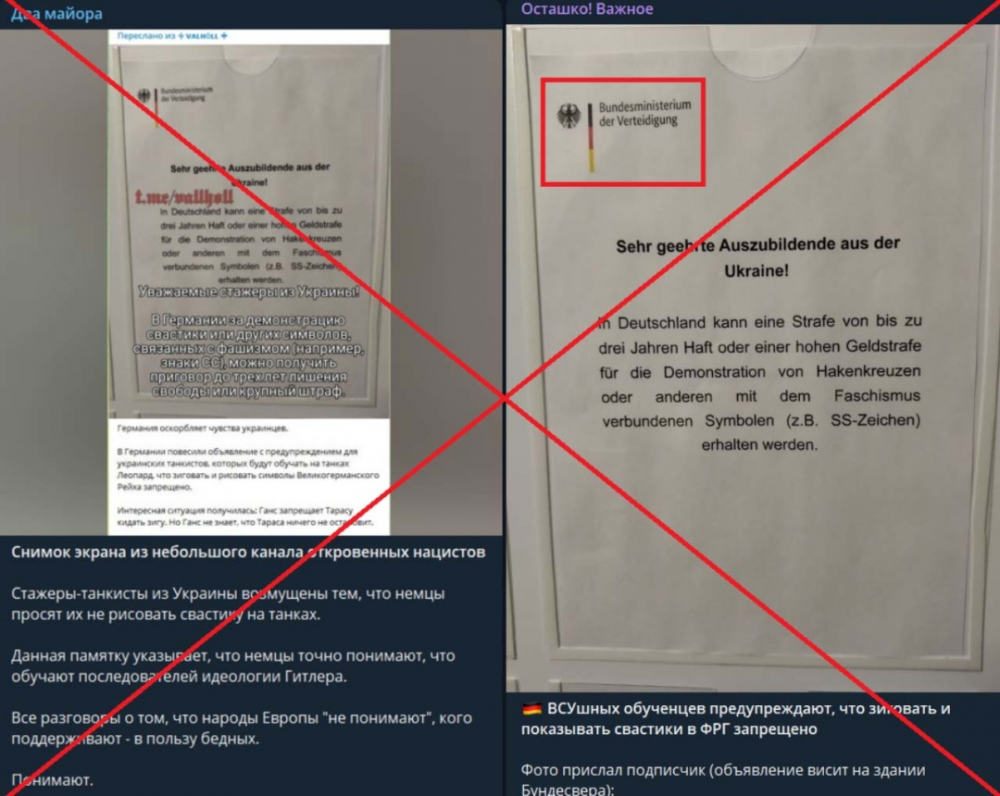 Телеграм-канали поширюють фото, на якому нібито розміщено оголошення від Міністерства Оборони Німеччини адресоване українським військовослужбовцям, які навчаються в Німеччині. Мовляв, за демонстрацію нацистської свастики чи подібних символів, пов‘язаних з фашизмом, слідує покарання до трьох років позбавлення волі або штраф. У коментарях під дописами пишуть, що фото стенду відзнято у будівлі Бундесверу, щоб попередити українців. Уточнюється, повідомлення адресоване танкістам, які приїхали навчатись до Німеччини. Але це неправда.