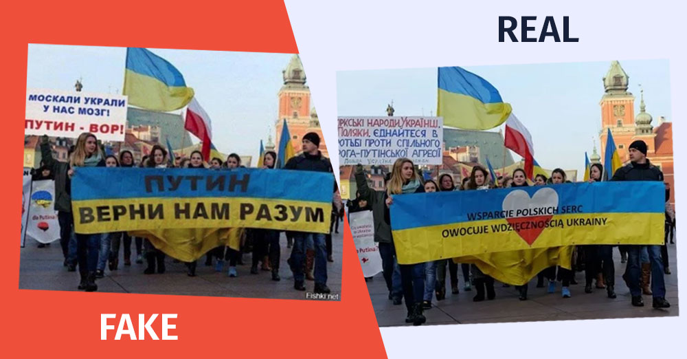 Фактчекери проєкту MythDetector з‘ясували, що світлина несправжня. Її підробили за допомогою спеціальних програм для редакції фото. Оригінальна світлина зроблена під час протестів Євромайдану в Україні 2014 року у Варшаві. На плакатах написано: «Єднаймося у боротьбі проти агресії спільного ворога — Путіна».