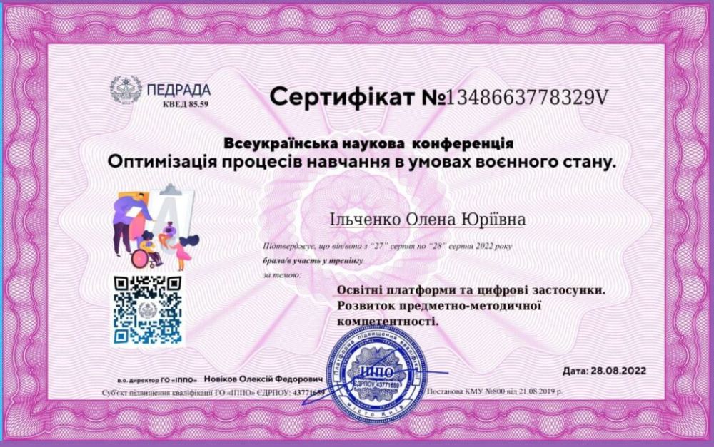 27 серпня 2022 р. докторка педагогічних наук Олена Ільченко та докторка педагогічних наук Леся Петренко взяли участь у Всеукраїнській науковій конференції «Оптимізація процесів навчання в умовах воєнного стану», зокрема у тренінгу «Освітні платформи та цифрові застосунки. Розвиток предметно-методичної компетентності».