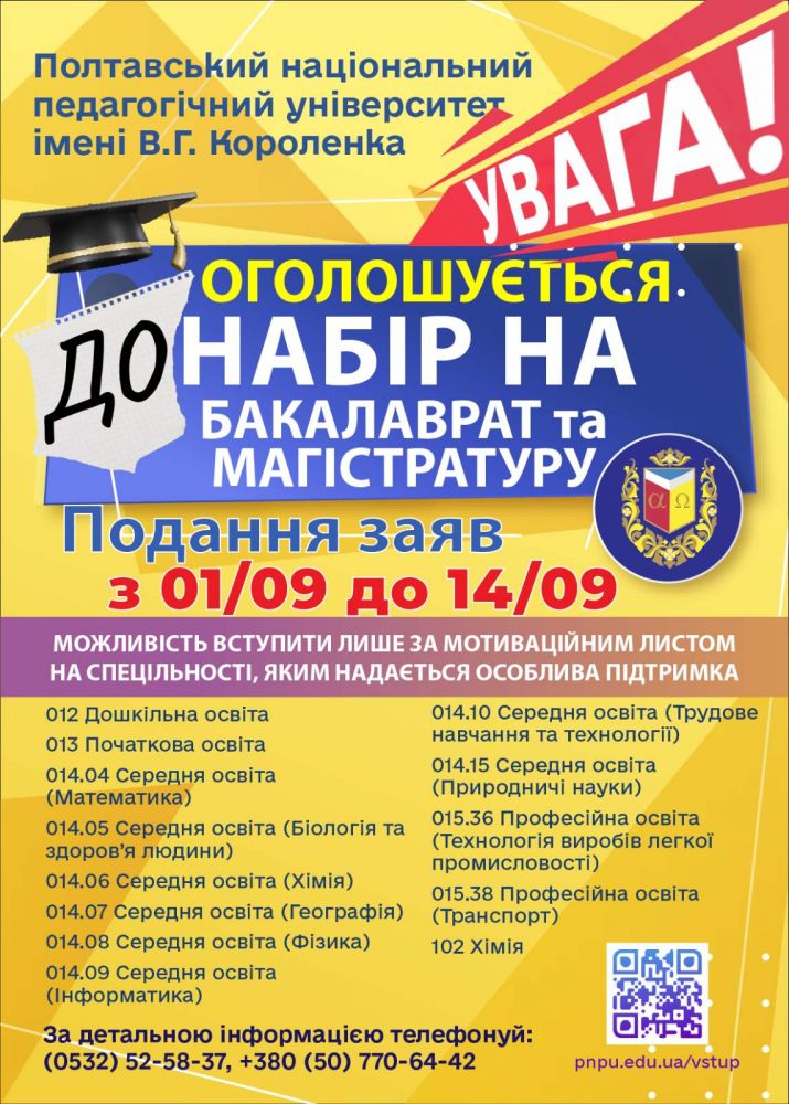 Оголошується донабір на бакалаврат та магістратуру 14 серпня 2023, 11:16 Автор: ПНПУ імені В.Г.Короленка